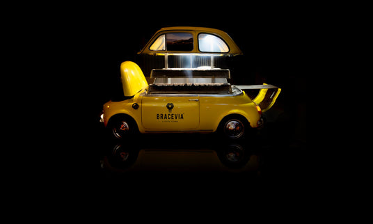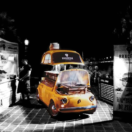 Dal 2008, con Bracevia - A Tutta Pecora, portiamo in giro la tradizione degli Arrosticini con il nostro inconfondibile stile. A bordo della nostra Fiat 500 d'epoca gialla, trasformata in una postazione di cottura unica, abbiamo partecipato ai più grandi eventi gastronomici italiani, dal Festival Internazionale del Cibo di Strada di Cesena al Salone del Gusto di Torino, spingendoci anche oltre i confini nazionali.